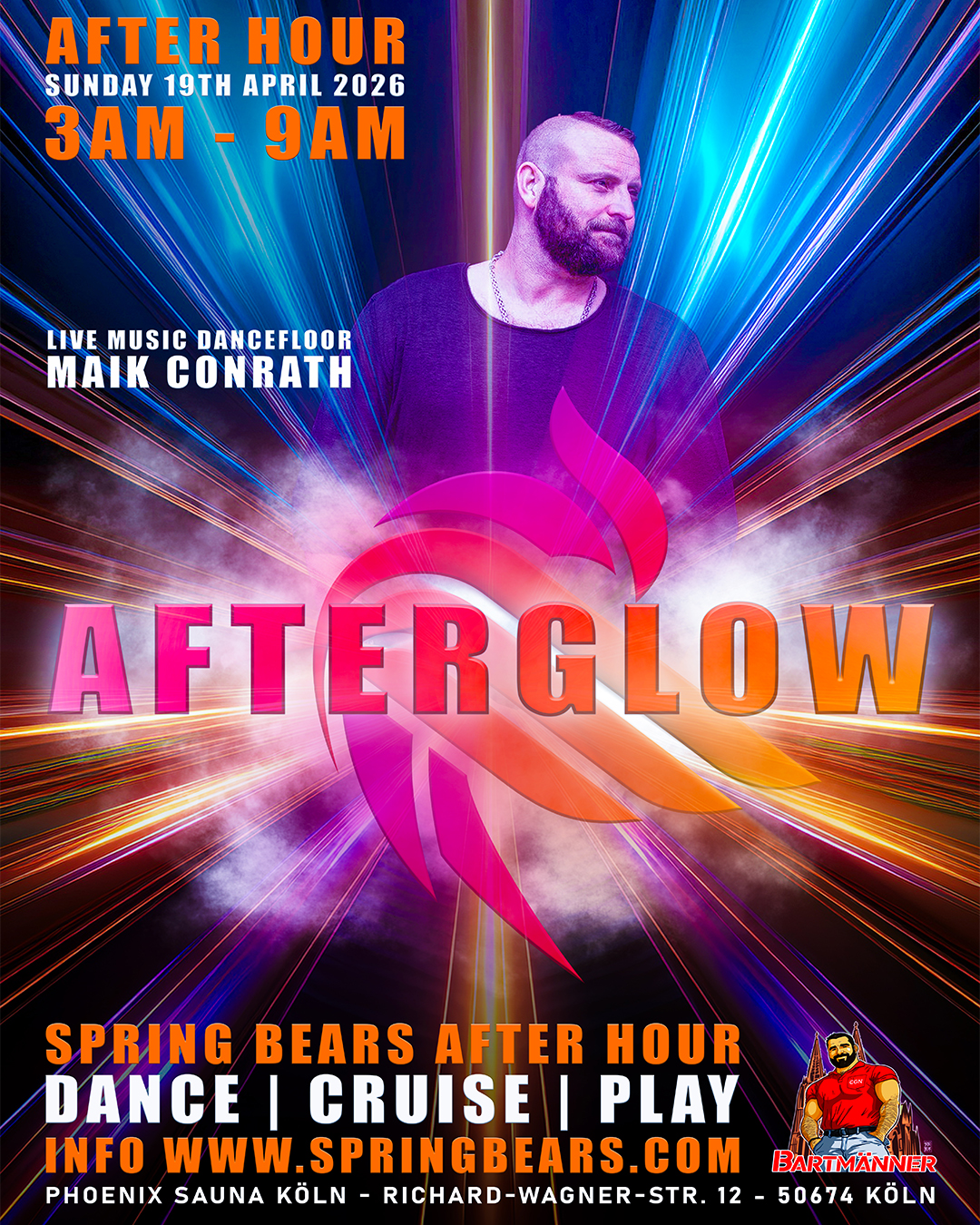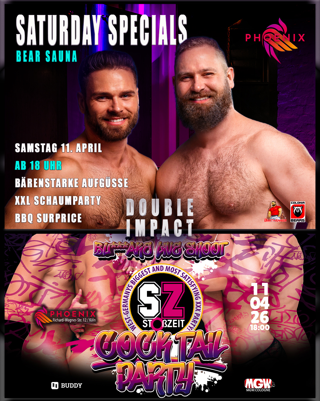 Genieße den Abend mit ganz speziellen Aufgüssen und Sauna Anwendungen die es nur zur BEAR gibt. Außerdem fluten wir die Dampfsauna wieder mit Meter hohem Schaum, der für ein prickelndes Erlebnis auf der Haut sorgt. Die Cruising Area bringt Euch zwischendurch auf andere Gedanken und so manch eine sinnliche Begegnung mit sich. Für das leibliche Wohl ist gesorgt.